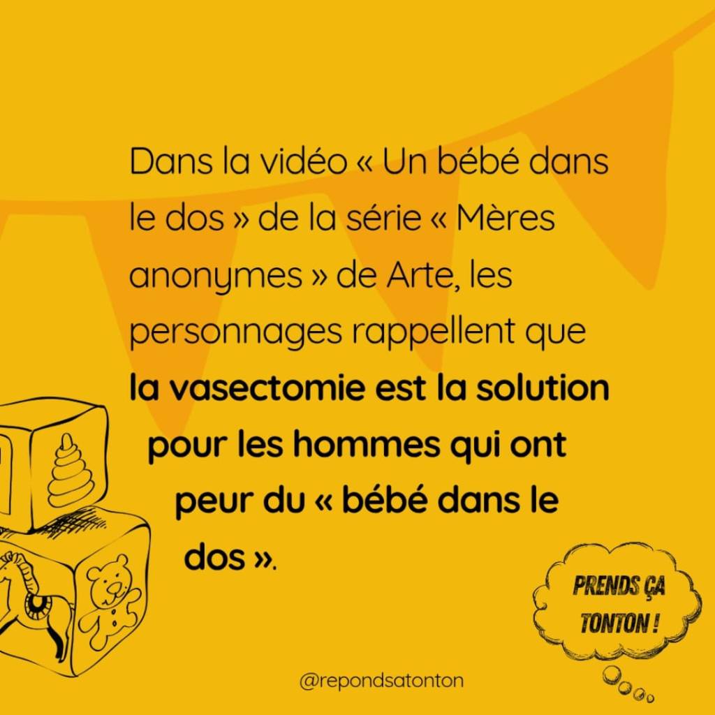 Dans la vidéo « Un bébé dans le dos » de la série « Mères anonymes » de Arte, les personnages rappellent que la vasectomie est la solution pour les hommes qui ont