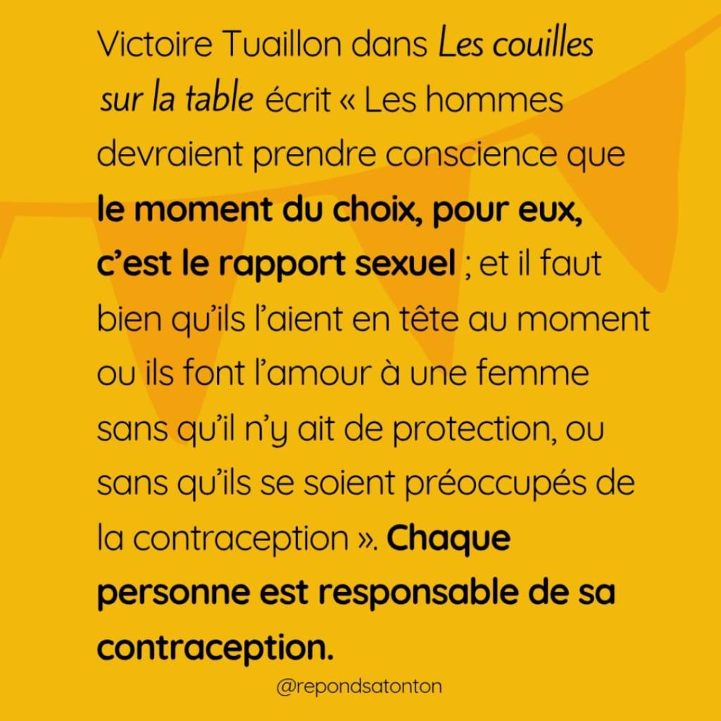 sur la table écrit « Les hommes devraient prendre conscience que le moment du choix, pour eux, c’est le rapport sexuel ; et il faut bien qu’ils l’aient en tête au moment ou ils font l’amour à une femme sans qu’il n’y ait de protection, ou sans qu’ils se soient préoccupés de la contraception »1.