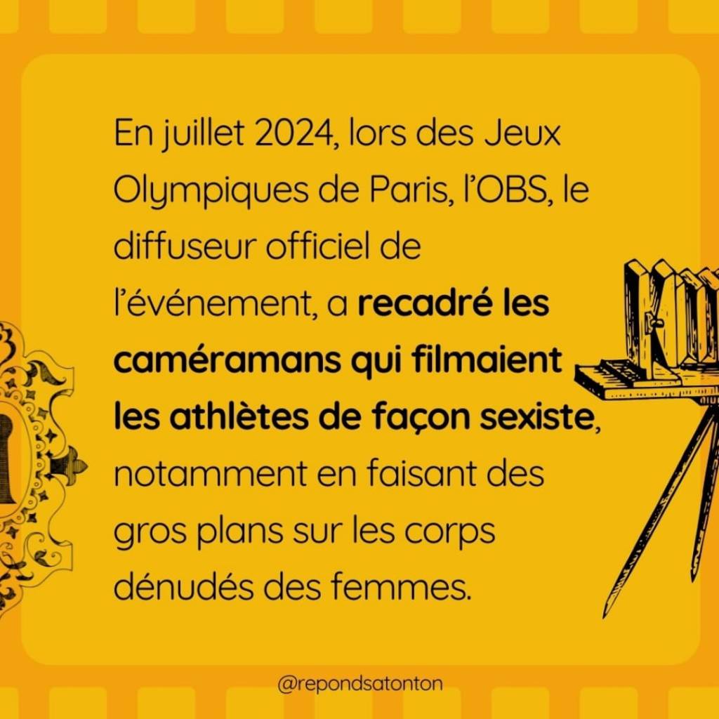 En juillet 2024, lors des Jeux Olympiques de Paris, l’OBS, le diffuseur officiel de l’événement, a recadré les caméramans qui filmaient les athlètes de façon sexiste, notamment en faisant des gros plans sur les corps dénudés des femmes2.