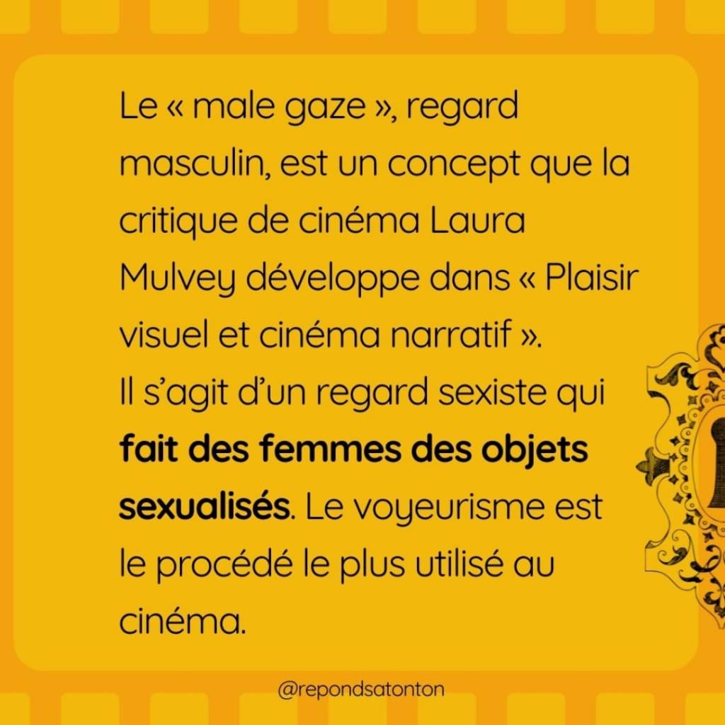 Le « male gaze », regard masculin, est un concept que la critique de cinéma Laura Mulvey développe dans « Plaisir visuel et cinéma narratif »1. Il s’agit d’un regard sexiste qui fait des femmes des objets sexualisés. Le voyeurisme est le procédé le plus utilisé au cinéma.
