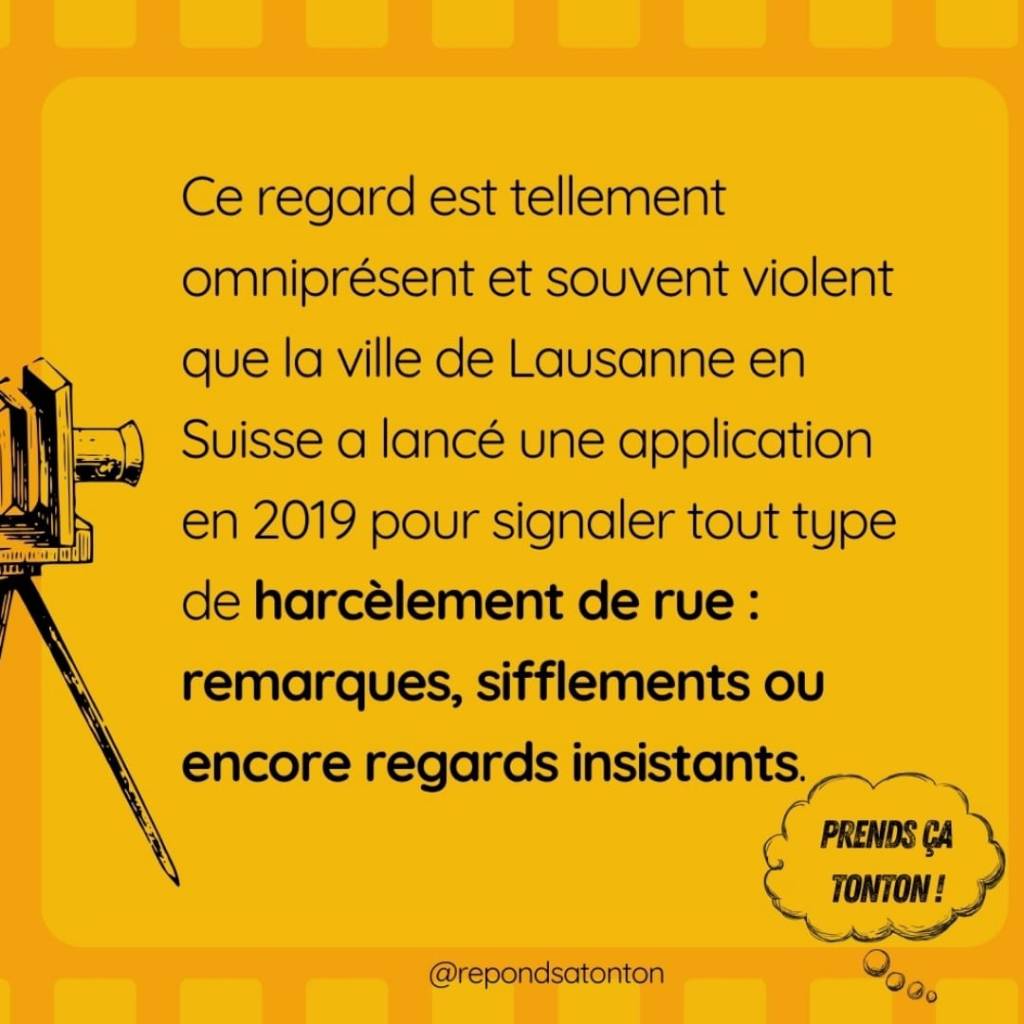 Ce regard est tellement omniprésent et souvent violent que la ville de Lausanne en Suisse a lancé une application en 2019 pour signaler tout type de harcèlement de rue : remarques, sifflements ou encore regards insistants3.