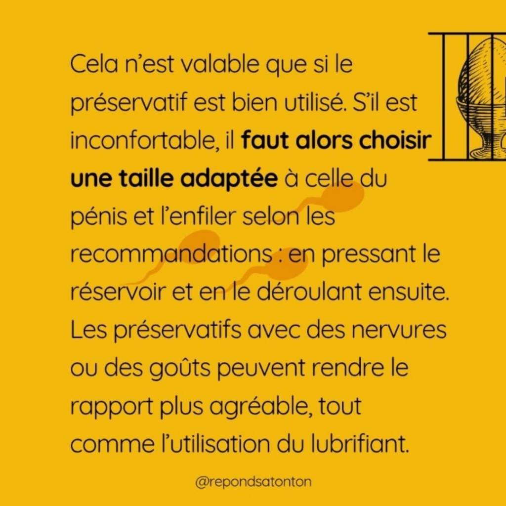 Cela n’est valable que si le préservatif est bien utilisé. S’il est inconfortable, il faut alors choisir une taille adaptée à celle du pénis et l’enfiler selon les recommandations : en pressant le réservoir et en le déroulant ensuite. Les préservatifs avec des nervures ou des goûts peuvent rendre le rapport plus agréable, tout comme l’utilisation du lubrifiant2.
