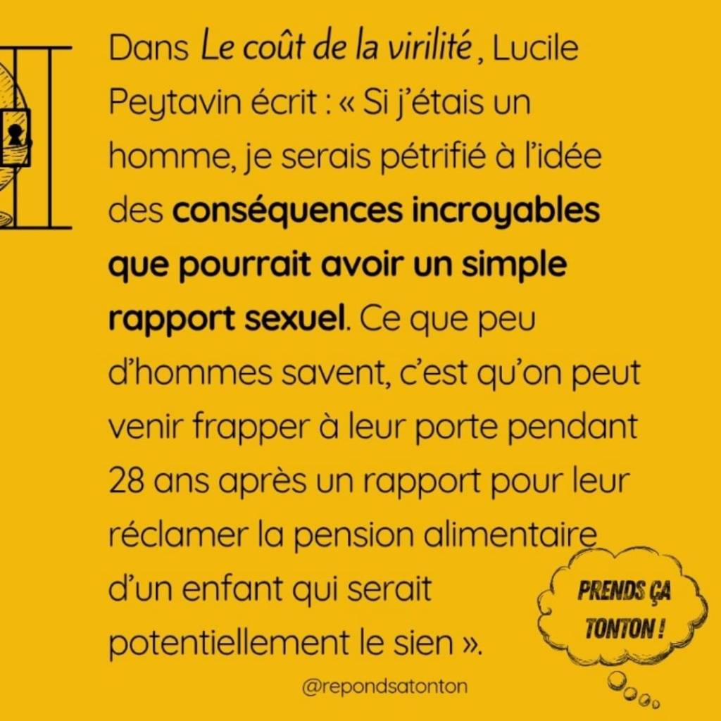 Dans Le coût de la virilité, Lucile Peytavin écrit : « Si j’étais un homme, je serais pétrifié à l’idée des conséquences incroyables que pourrait avoir un simple rapport sexuel. Ce que peu d’hommes savent, c’est qu’on peut venir frapper à leur porte pendant 28 ans après un rapport pour leur réclamer la pension alimentaire d’un enfant qui serait potentiellement le sien »3.