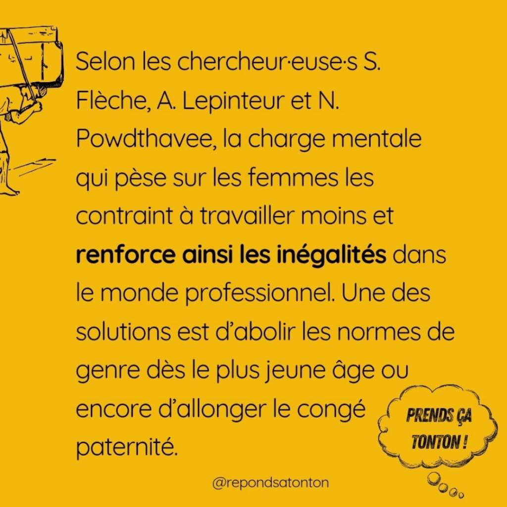 Selon les chercheur·euse·s S. Flèche, A. Lepinteur et N. Powdthavee3, la charge mentale qui pèse sur les femmes les contraint à travailler moins et renforce ainsi les inégalités dans le monde professionnel. Une des solutions est d’abolir les normes de genre dès le plus jeune âge ou encore d’allonger le congé paternité.