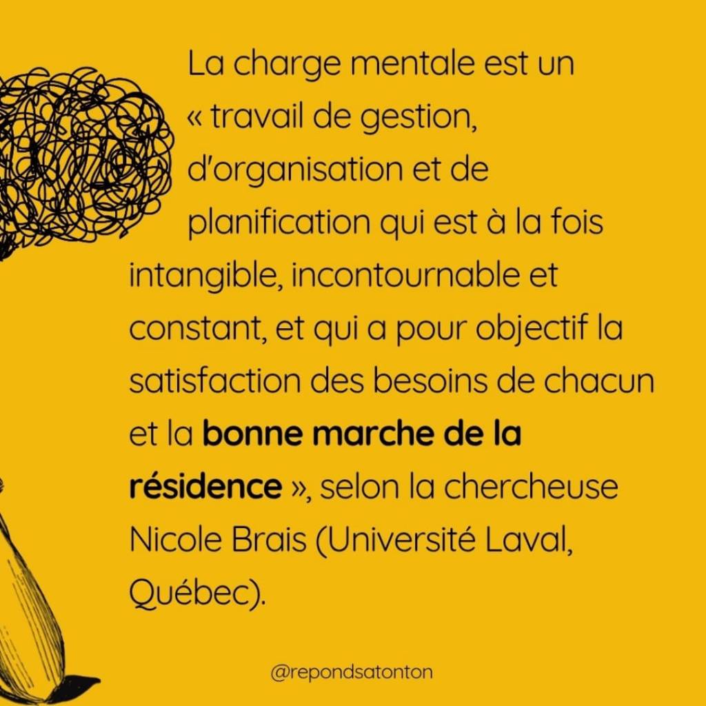 La charge mentale est un « travail de gestion, d’organisation et de planification qui est à la fois intangible, incontournable et constant, et qui a pour objectif la satisfaction des besoins de chacun et la bonne marche de la résidence », selon la chercheuse Nicole Brais (Université Laval, Québec)1.
