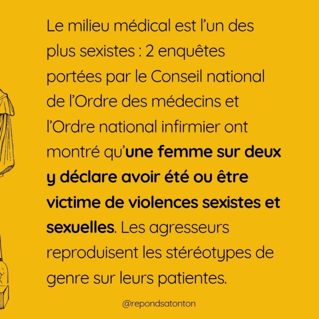 Le milieu médical est l’un des plus sexistes : 2 enquêtes portées par le Conseil national de l’Ordre des médecins et l’Ordre national infirmier1 ont montré qu’une femme sur deux y déclare avoir été ou être victime de violences sexistes et sexuelles. Les agresseurs reproduisent les stéréotypes de genre sur leurs patientes.