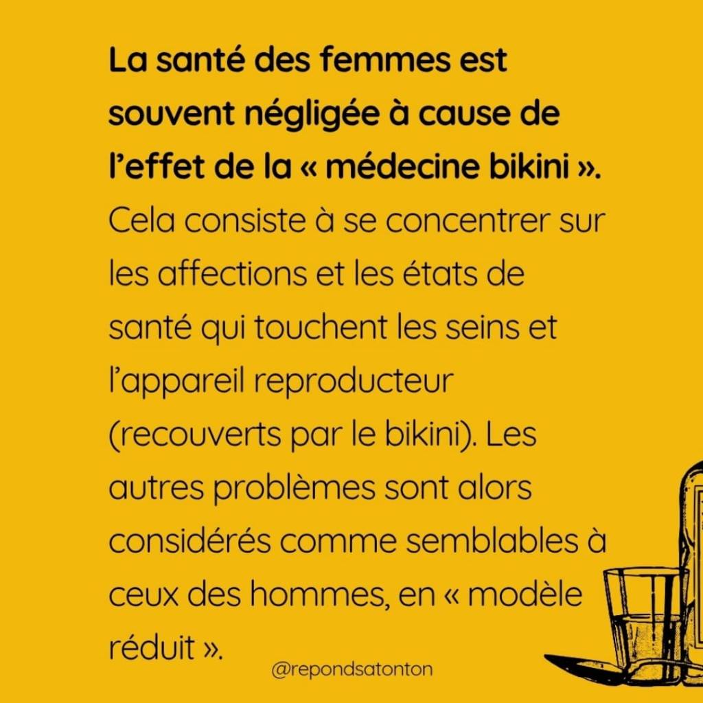 La santé des femmes est souvent négligée à cause de l’effet de la « médecine bikini »2. Cela consiste à se concentrer sur les affections et les états de santé qui touchent les seins et l’appareil reproducteur (recouverts par le bikini). Les autres problèmes sont alors considérés comme semblables à ceux des hommes, en « modèle réduit ».