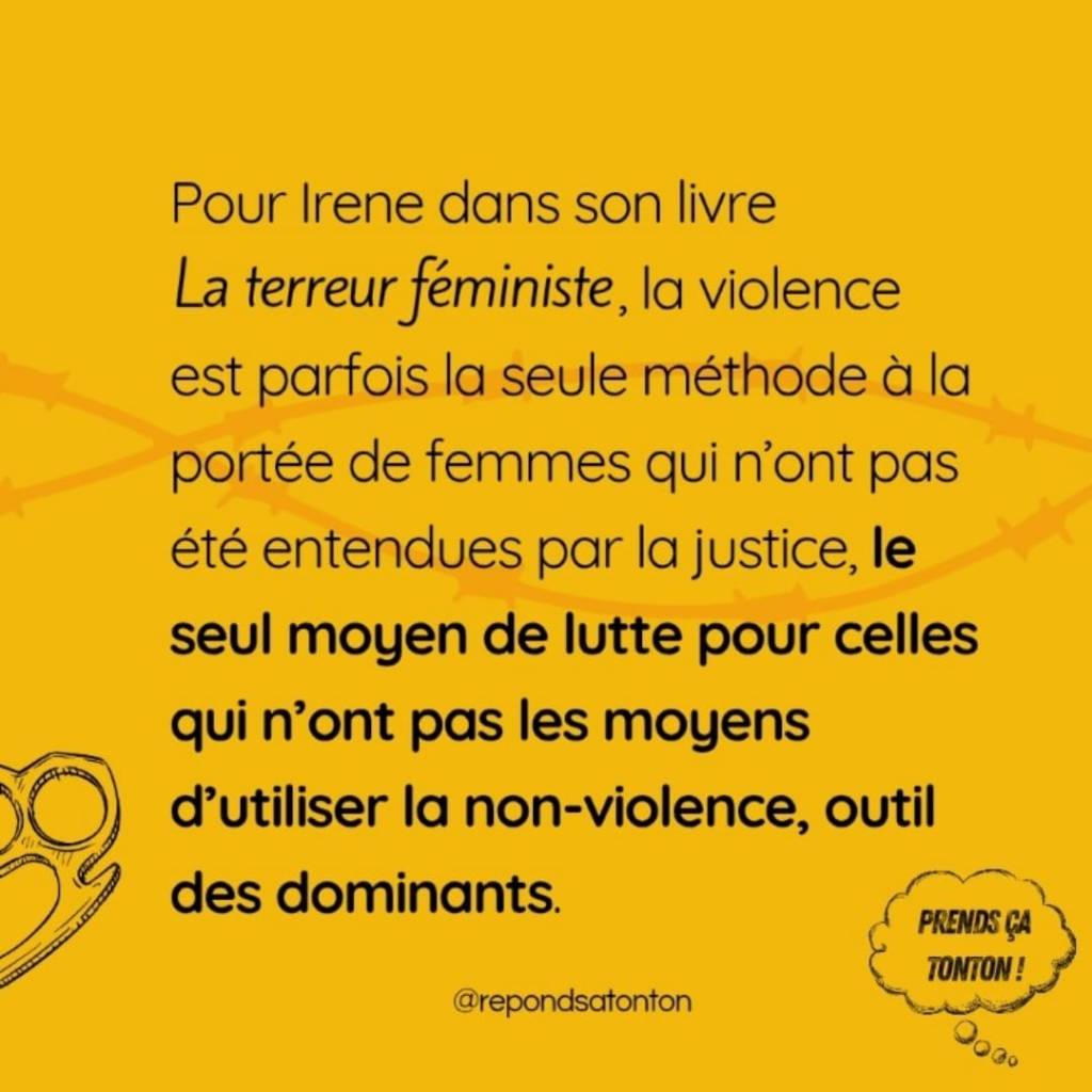 Pour Irene dans son livre Terreur féministe3 , la violence est parfois la seule méthode à la portée de femmes qui n’ont pas été entendues par la justice, le seul moyen de lutte pour celles qui n’ont pas les moyens d’utiliser la non-violence, outil des dominants.