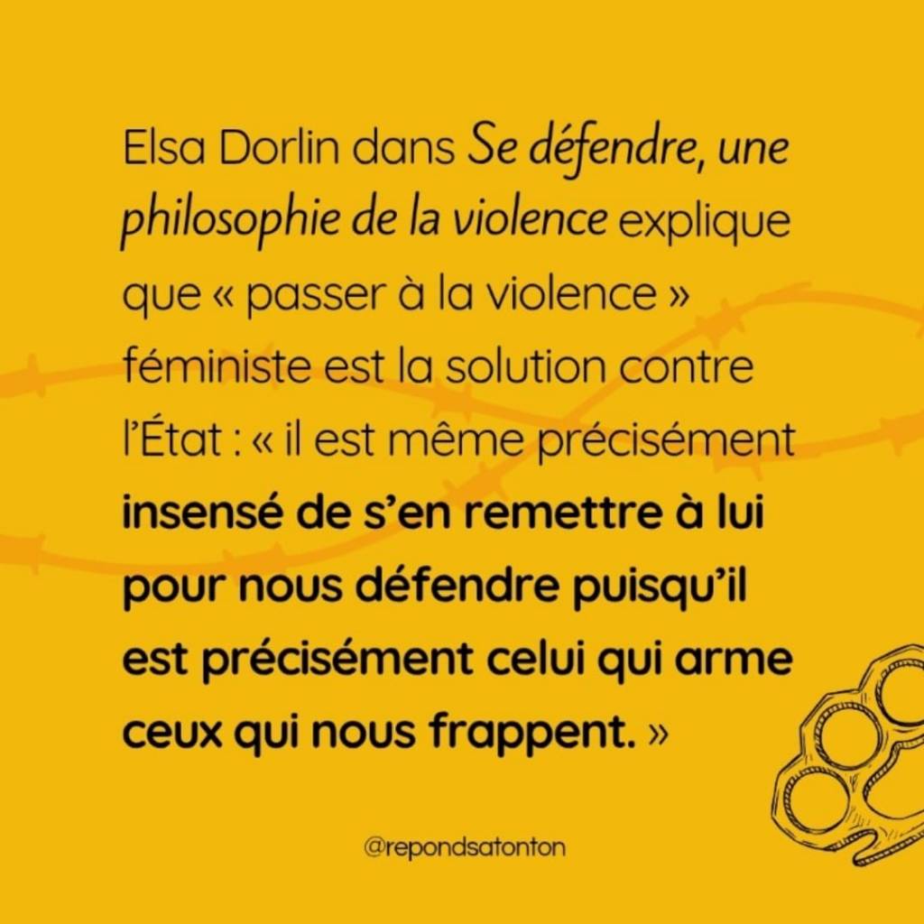 Elsa Dorlin dans Se défendre une philosophie de la violence2 explique que « passer à la violence » féministe est la solution contre l’État : « il est même précisément insensé de s’en remettre à lui pour nous défendre puisqu’il est précisément celui qui arme ceux qui nous frappent. »