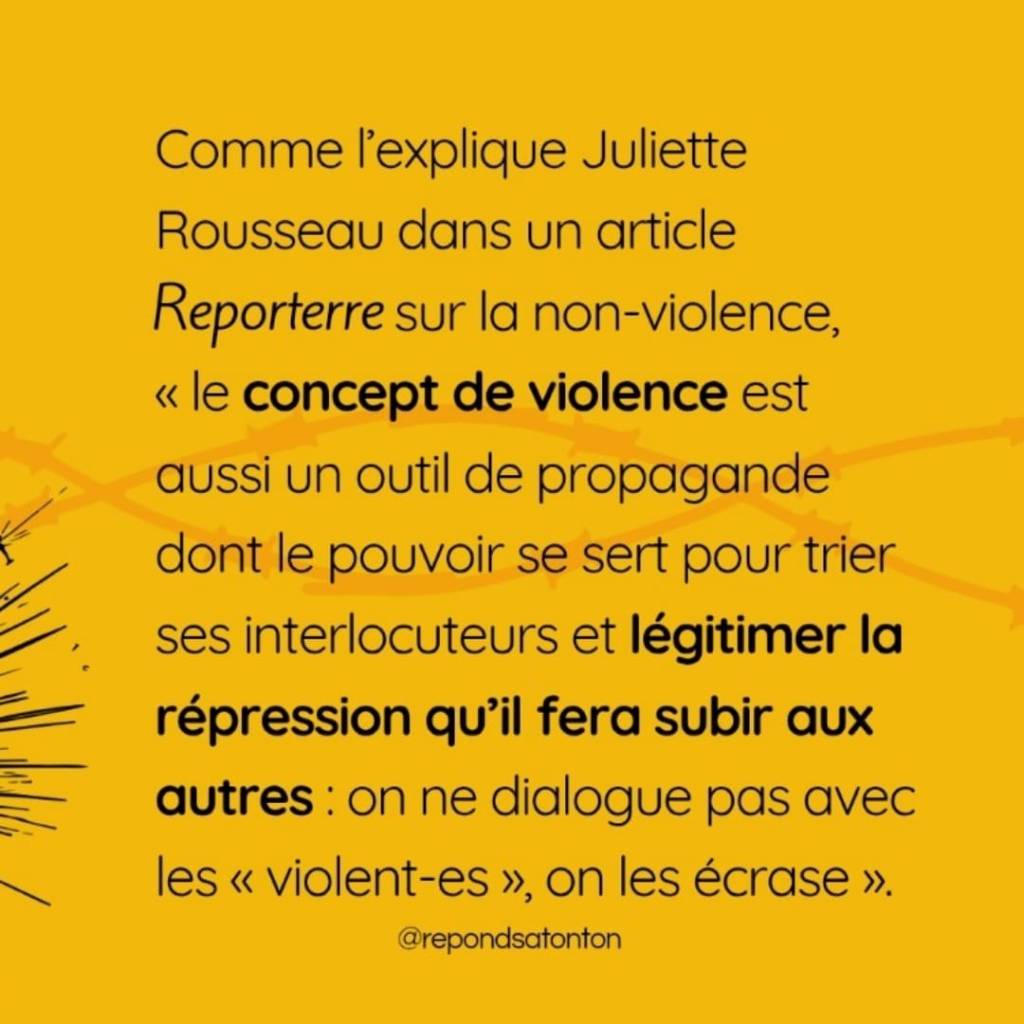 Comme l’explique Juliette Rousseau dans un article Reporterre1 sur la non-violence, « le concept de violence est aussi un outil de propagande dont le pouvoir se sert pour trier ses interlocuteurs et légitimer la répression qu’il fera subir aux autres : on ne dialogue pas avec les « violent-es », on les écrase ».