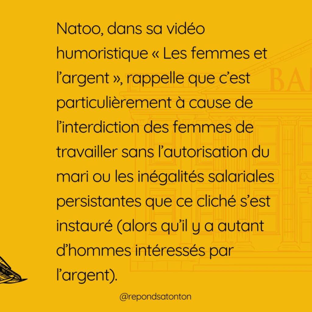 Natoo, dans sa vidéo humoristique « Les femmes et l’argent »1, rappelle que c’est particulièrement à cause de l’interdiction des femmes de travailler sans l’autorisation du mari ou les inégalités salariales persistantes que ce cliché s’est instauré (alors qu’il y a autant d’hommes intéressés par l’argent).