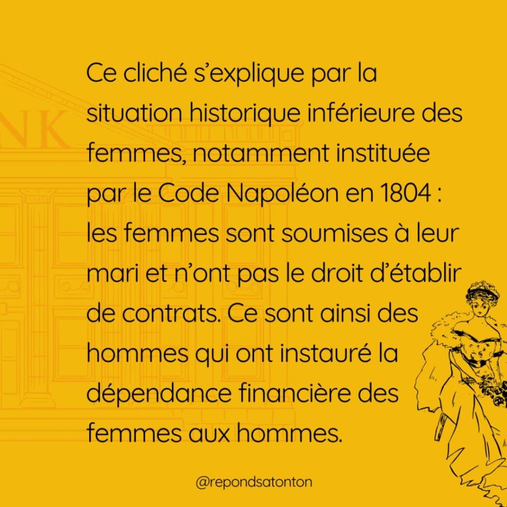 Ce cliché s’explique par la situation historique inférieure des femmes, notamment instituée par le Code Napoléon en 18042 : les femmes sont soumises à leur mari et n’ont pas le droit d’établir de contrats. Ce sont ainsi des hommes qui ont instauré la dépendance financière des femmes aux hommes.