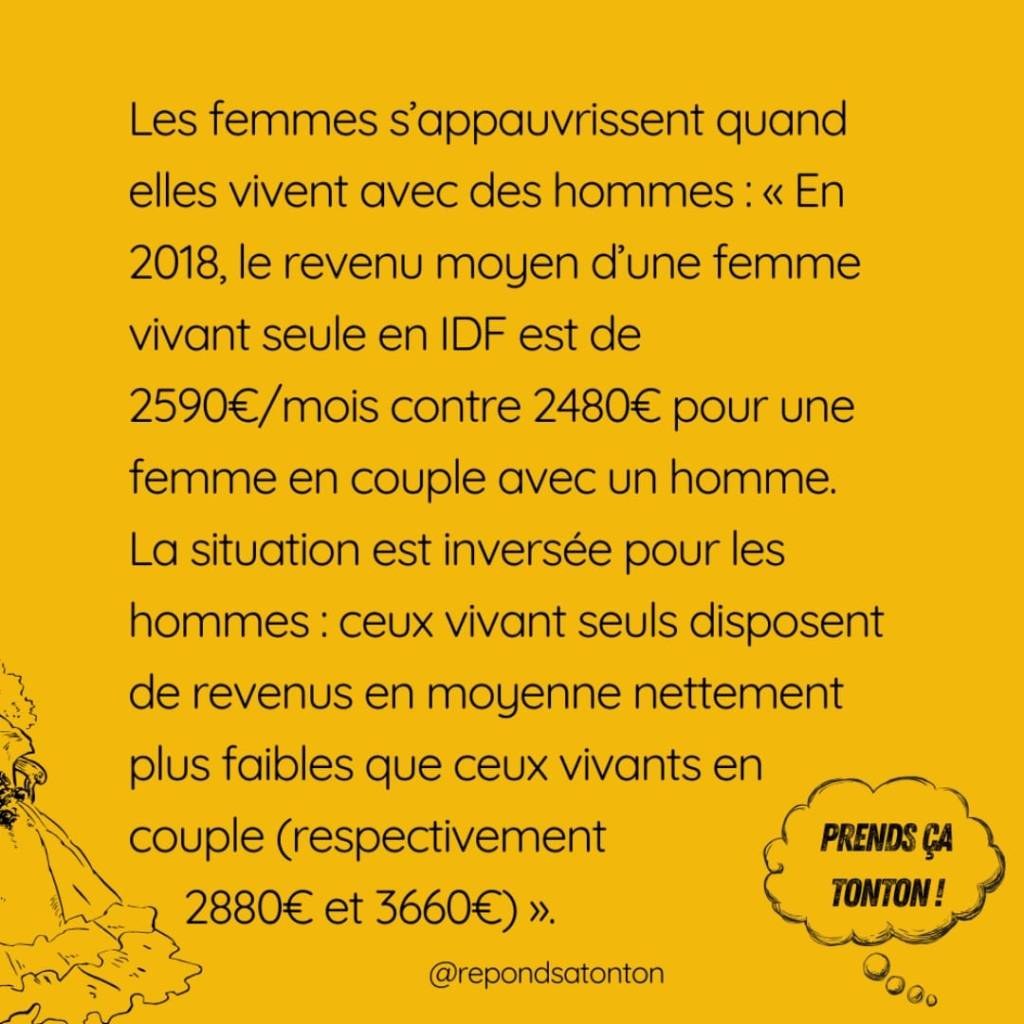 Les femmes s’appauvrissent quand elles vivent avec des hommes : « En 2018, le revenu moyen d’une femme vivant seule en IDF est de 2590€/mois contre 2480€ pour une femme en couple avec un homme. La situation est inversée pour les hommes : ceux vivant seuls disposent de revenus en moyenne nettement plus faibles que ceux vivants en couple (respectivement 2880€ et 3660€) »3.