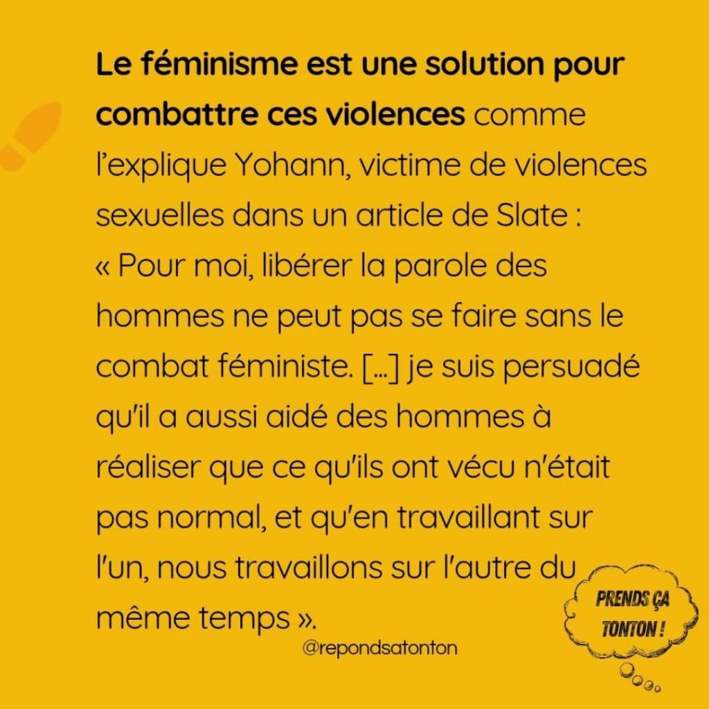 Le féminisme est une solution pour combattre ces violences comme l’explique Yohann, victime de violences sexuelles dans un article de Slate : « Pour moi, libérer la parole des hommes ne peut pas se faire sans le combat féministe. […] je suis persuadé qu’il a aussi aidé des hommes à réaliser que ce qu’ils ont vécu n’était pas normal, et qu’en travaillant sur l’un, nous travaillons sur l’autre du même temps »3.