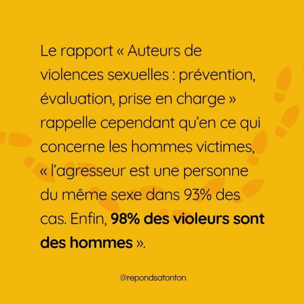 Le rapport « Auteurs de violences sexuelles : prévention, évaluation, prise en charge »2 rappelle cependant qu’en ce qui concerne les hommes victimes, « l’agresseur est une personne du même sexe dans 93% des cas. Enfin, 98% des violeurs sont des hommes ».