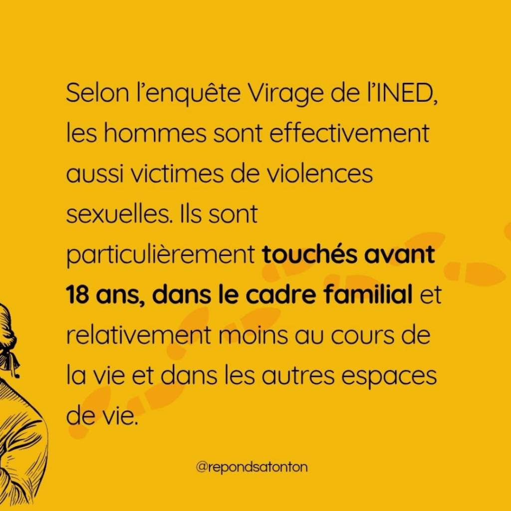 Selon l’enquête Virage de l’INED1, les hommes sont effectivement aussi victimes de violences sexuelles. Ils sont particulièrement touchés avant 18 ans, dans le cadre familial et relativement moins au cours de la vie et dans les autres espaces de vie.
