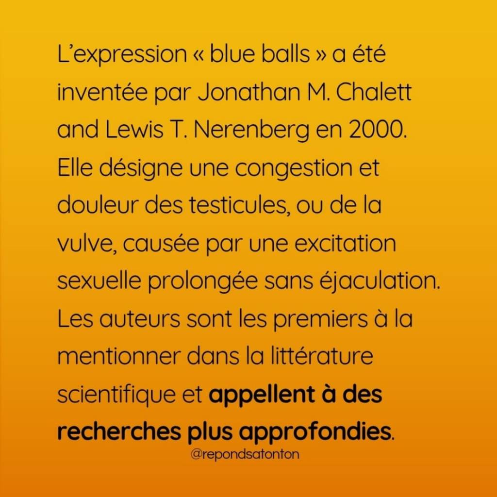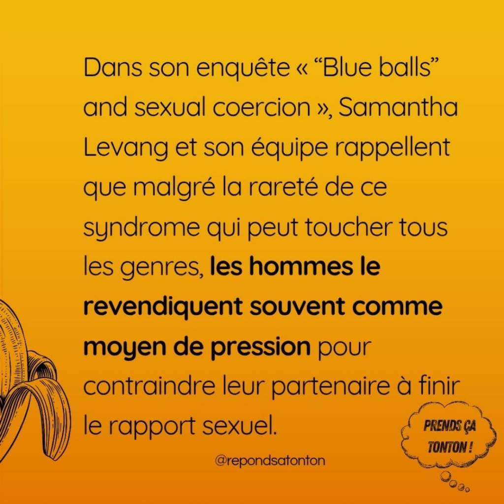 Dans son enquête « “Blue balls” and sexual coercion »3, Samantha Levang et son équipe rappellent que malgré la rareté de ce syndrome qui pourrait toucher tous les genres, les hommes le revendiquent souvent comme moyen de pression pour contraindre leur partenaire à finir le rapport sexuel.