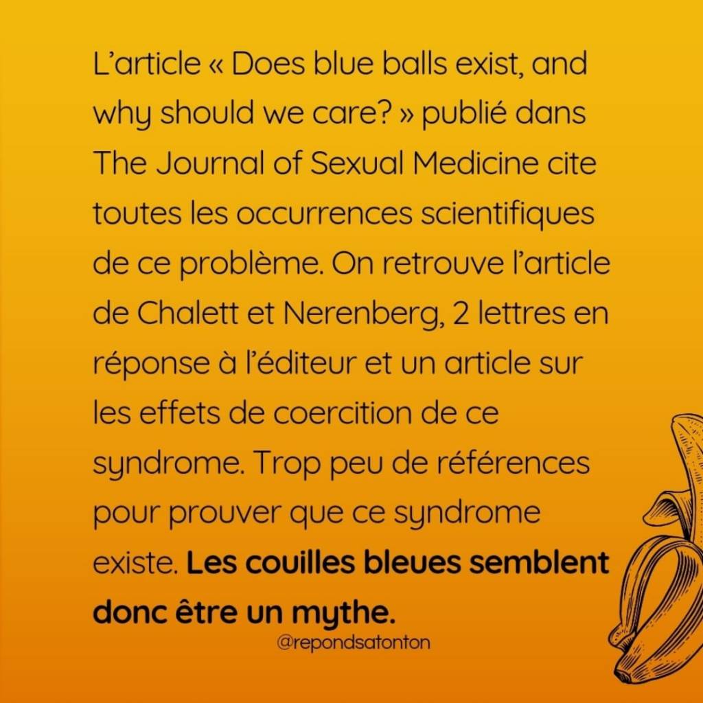 L’article « Does blue balls exist, and why should we care? »2 publié dans The Journal of Sexual Medicine cite toutes les occurrences scientifiques de ce problème. Parmi elles, on retrouve l’article de Chalett et Nerenberg, 2 lettres en réponse à l’éditeur et un article sur les effets de coercition de ce syndrome. Trop peu de références pour prouver que ce syndrome existe. Les couilles bleues semblent donc être un mythe.